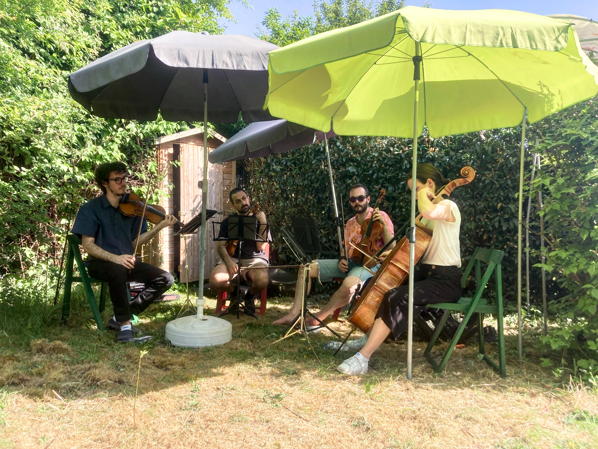 Das Stück „dried up sounds“ entstand im Frühjahr 2025 als Teil der Performance „großBkleinG – Über Hütten und Paläste“ des Kollektivs Untere Reklamationsbehörde. Im Vorfeld der Komposition wurden im Februar ’25 Field Recordings in einem brach liegenden Kleingarten gesammelt. Dabei entstand eine Sammlung an Klängen, die mit vertrockneten Pflanzen produziert werden können, wie wenn man z.B. mit den Fingern an den Stacheln verschiedener Diesteln entlang schabt. Dieses Klangarchiv diente als Inspiration für das Streichquartett „dried up sound“. Das Stück wurde in dem gleichen Kleingarten uraufgeführt, allerdings Monate später, als der Garten bereits erneut grün erblühte. Es ist eine akustische Momentaufnahme übersetzt in musikalische Strukturen, gespielt von vier Streichinstrumenten.